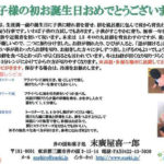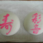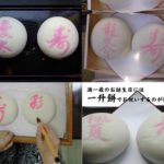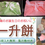 一升餅は、生後満一歳の誕生日に子供に晴れ着を着せ、餅を風呂敷に包んでから肩から背負わせ無事生育を祝う行事です。いわば子供の力試しでもあります。子供がすこやかに育ち、無事一年を迎えたことを家族や近親者を招いて祝います。本来は1.5キロの丸目餅を背負わせるのですが、重たくて背負うのが難しいので、二つに振り分けました。(ご希望の方のみ2つではなく1つの丸目餅にします。)お餅が割れたり、ひびが入ると、「道が開ける」と喜びます。お祝い事が終わったらお餅を切り、お招きした方々に少しずつ差し上げるのもよいでしょう。また、昔からお餅を食べるとおっぱいがよく出るとも言われています。冬はお餅が固くなり切りづらくなりますので、2~3分レンジにかけてからの方が切りやすくなります。