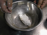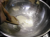 6.砂糖と水を少しずつ加えながら、木べらで練ります。 |