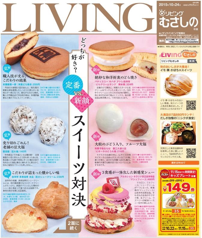 2015年10月24日発行の『リビングむさしの』トップ紙面に、末廣屋喜一郎「末喜どら焼き」が、定番スイーツ「職人技が光る、こだわりの銘菓」として掲載されました。